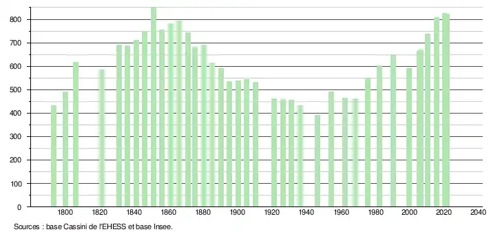 L'évolution du nombre d'habitants est connue à travers les recensements de la population effectués dans la commune depuis 1793. Pour les communes de moins de 10 000 habitants, une enquête de recensement portant sur toute la population est réalisée tous les cinq ans, les populations légales des années intermédiaires étant quant à elles estimées par interpolation ou extrapolation[17]. Pour la commune, le premier recensement exhaustif entrant dans le cadre du nouveau dispositif a été réalisé en 2005[18].