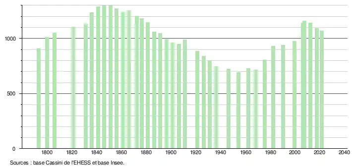 L'évolution du nombre d'habitants est connue à travers les recensements de la population effectués dans la commune depuis 1793. Pour les communes de moins de 10 000 habitants, une enquête de recensement portant sur toute la population est réalisée tous les cinq ans, les populations légales des années intermédiaires étant quant à elles estimées par interpolation ou extrapolation[21]. Pour la commune, le premier recensement exhaustif entrant dans le cadre du nouveau dispositif a été réalisé en 2007[22].