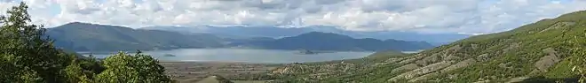 Vue panoramique du Petit lac Prespa depuis l'est avec les îles de Vidronisi (à gauche) et d'Ágios Achíllios (à droite).