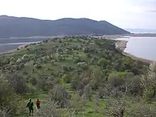Le Petit lac Prespa avec les îles de Vidronisi (à gauche) et d'Ágios Achíllios (à droite). | |