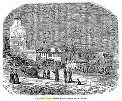 « Justement, mon garçon, – reprit Pique-Vinaigre, et le quartier de la Cité, qui n’est pourtant pas composé de palais, serait comme qui dirait la rue de la Paix ou la rue de Rivoli, auprès de la Petite-Pologne ; quelle turne ! mais, du reste, fameux repaire pour la pègre ; il n’y avait pas de rues, mais des ruelles ; pas de maisons, mais des masures pas de pavé, mais un petit tapis de boue et de fumier, ce qui faisait que le bruit des voitures ne vous aurait pas incommodé s’il en avait passé mais il n’en passait pas. Du matin jusqu’au soir, et surtout du soir jusqu’au matin, ce qu’on ne cessait pas d’entendre, c’était des cris : À la garde ! au secours ! au meurtre ! mais la garde ne se dérangeait pas. Tant plus il y avait d’assommés dans la Petite-Pologne, tant moins il y avait de gens à arrêter Ça grouillait donc de monde là-dedans, fallait voir : il y logeait peu de bijoutiers, d’orfèvres et de banquiers ; mais, en revanche, il y avait des tas de joueurs d’orgue, de paillasses, de polichinelles ou de montreurs de bêtes curieuses[11]. »