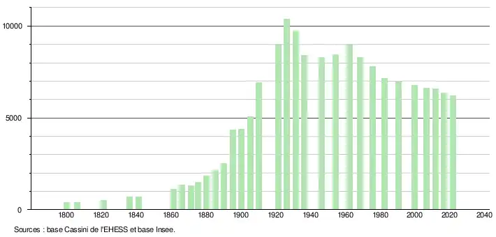 L'évolution du nombre d'habitants est connue à travers les recensements de la population effectués dans la commune depuis 1800. Pour les communes de moins de 10 000 habitants, une enquête de recensement portant sur toute la population est réalisée tous les cinq ans, les populations légales des années intermédiaires étant quant à elles estimées par interpolation ou extrapolation[28]. Pour la commune, le premier recensement exhaustif entrant dans le cadre du nouveau dispositif a été réalisé en 2006[29].