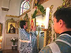 - On emploie dans cette description le terme « diacre » au singulier, mais il peut ne pas y avoir de diacre — auquel cas le rituel est légèrement modifié — ou bien plusieurs diacres et sous-diacres, selon l'importance du service (importance de la fête, du sanctuaire, présence ou non de l'évêque, nombre de fidèles, etc.)