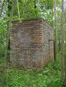 Je vivais à Longniddry depuis 1927 jusqu'à ce que ma femme et moi déménagions... il y a vingt ans. [...] Il était sur une plate-forme très haute dans les arbres en face d'une tranchée dans la route entre deux vieux poteaux télégraphiques. Je crois me souvenir que le réservoir était aussi haut que les poteaux télégraphiques. Un tuyau vertical relié au réservoir était raccordé à un tuyau horizontal fixé sur le haut du mur. Ce tuyau avait une série de petits trous sur sa longueur. L’ouverture d'une vanne à l'intérieur du bois permettait à l'essence de s’échapper à une pression considérable.