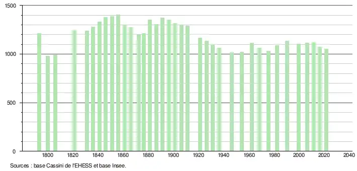 L'évolution du nombre d'habitants est connue à travers les recensements de la population effectués dans la commune depuis 1793. Pour les communes de moins de 10 000 habitants, une enquête de recensement portant sur toute la population est réalisée tous les cinq ans, les populations légales des années intermédiaires étant quant à elles estimées par interpolation ou extrapolation[29]. Pour la commune, le premier recensement exhaustif entrant dans le cadre du nouveau dispositif a été réalisé en 2006[30].