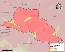 Le retrait-gonflement des sols argileux est susceptible d'engendrer des dommages importants aux bâtiments en cas d’alternance de périodes de sécheresse et de pluie. La totalité de la commune est en aléa moyen ou fort (75,2 % au niveau départemental et 48,5 % au niveau national). Sur les 212 bâtiments dénombrés sur la commune en 2019, 212 sont en aléa moyen ou fort, soit 100 %, à comparer aux 94 % au niveau départemental et 54 % au niveau national. Une cartographie de l'exposition du territoire national au retrait gonflement des sols argileux est disponible sur le site du BRGM[20],[Carte 3].