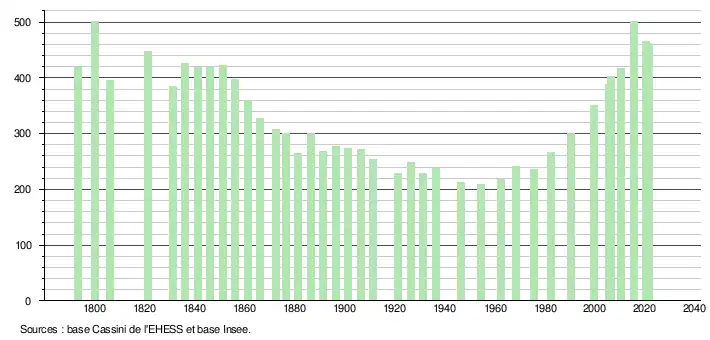 - Population municipale légale en vigueur au 1er janvier 2024, millésimée 2021, définie dans les limites territoriales en vigueur au 1er janvier 2023, date de référence statistique : 1er janvier 2021.