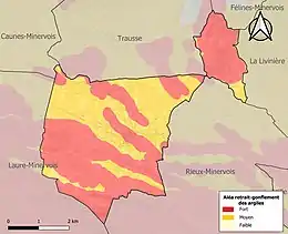 Le retrait-gonflement des sols argileux est susceptible d'engendrer des dommages importants aux bâtiments en cas d’alternance de périodes de sécheresse et de pluie. La totalité de la commune est en aléa moyen ou fort (75,2 % au niveau départemental et 48,5 % au niveau national). Sur les 662 bâtiments dénombrés sur la commune en 2019, 662 sont en aléa moyen ou fort, soit 100 %, à comparer aux 94 % au niveau départemental et 54 % au niveau national. Une cartographie de l'exposition du territoire national au retrait gonflement des sols argileux est disponible sur le site du BRGM[22],[Carte 3].