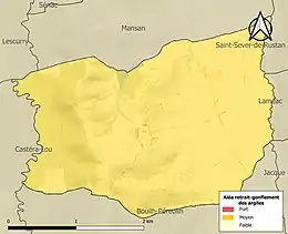Le retrait-gonflement des sols argileux est susceptible d'engendrer des dommages importants aux bâtiments en cas d’alternance de périodes de sécheresse et de pluie. La totalité de la commune est en aléa moyen ou fort (44,5 % au niveau départemental et 48,5 % au niveau national). Sur les 46 bâtiments dénombrés sur la commune en 2019, 46 sont en aléa moyen ou fort, soit 100 %, à comparer aux 75 % au niveau départemental et 54 % au niveau national. Une cartographie de l'exposition du territoire national au retrait gonflement des sols argileux est disponible sur le site du BRGM[18],[Carte 2].