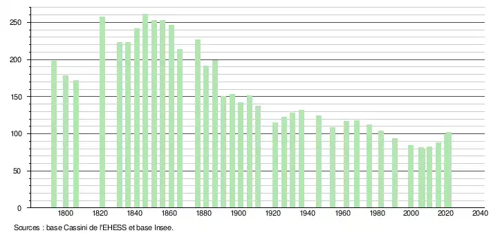 | L'évolution du nombre d'habitants est connue à travers les recensements de la population effectués dans la commune depuis 1793. Pour les communes de moins de 10 000 habitants, une enquête de recensement portant sur toute la population est réalisée tous les cinq ans, les populations légales des années intermédiaires étant quant à elles estimées par interpolation ou extrapolation[24]. Pour la commune, le premier recensement exhaustif entrant dans le cadre du nouveau dispositif a été réalisé en 2005[25]. En 2021, la commune comptait 102 habitants[Note 5], en augmentation de 15,91 % par rapport à 2015 (Hautes-Pyrénées : +1,04 %, France hors Mayotte : +1,84 %). |