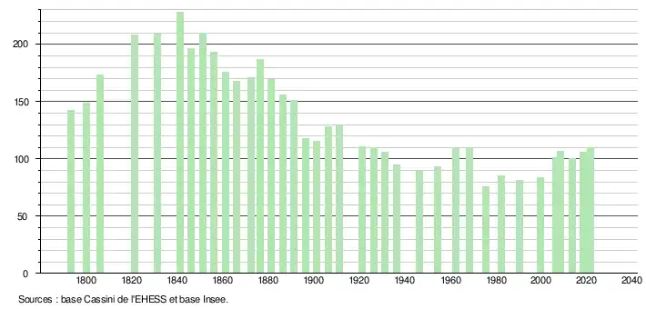 | L'évolution du nombre d'habitants est connue à travers les recensements de la population effectués dans la commune depuis 1793. Pour les communes de moins de 10 000 habitants, une enquête de recensement portant sur toute la population est réalisée tous les cinq ans, les populations légales des années intermédiaires étant quant à elles estimées par interpolation ou extrapolation[22]. Pour la commune, le premier recensement exhaustif entrant dans le cadre du nouveau dispositif a été réalisé en 2008[23]. En 2021, la commune comptait 110 habitants[Note 3], en augmentation de 11,11 % par rapport à 2015 (Gers : +0,79 %, France hors Mayotte : +1,84 %). |