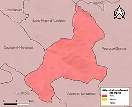 Le retrait-gonflement des sols argileux est susceptible d'engendrer des dommages importants aux bâtiments en cas d’alternance de périodes de sécheresse et de pluie. La totalité de la commune est en aléa moyen ou fort (94,5 % au niveau départemental et 48,5 % au niveau national). Sur les 48 bâtiments dénombrés sur la commune en 2019, 48 sont en aléa moyen ou fort, soit 100 %, à comparer aux 93 % au niveau départemental et 54 % au niveau national. Une cartographie de l'exposition du territoire national au retrait gonflement des sols argileux est disponible sur le site du BRGM[21],[Carte 3].