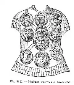 On retrouve également cet élément sur les harnachements des chevaux dans l’Antiquité[4],[5]. Ces phalères remises aux légionnaires romains pour leurs actes de bravoure ou les campagnes auxquelles ils avaient participé victorieusement se portaient accrochées sur la cuirasse.