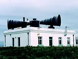 Construit par Trinity House en 1906, le bâtiment recevant la corne de brume est devenu un bâtiment classé de Grade II. La sirène était à l'origine alimentée par un moteur de 15 ch qui donnait deux explosions rapides à des intervalles de deux minutes qui pourraient être clairement entendus par les gens vivant sur l'île, jusqu'à de nombreuses années après la Seconde Guerre mondiale. Les bénévoles de la Flat Holm Society, avec l'aide de la The Prince's Trust, ont restauré le klaxon et ses moteurs dans les années 1960.
