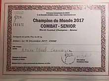 Champion du monde de savate boxe française catégorie poids lourds en en Chine[4].