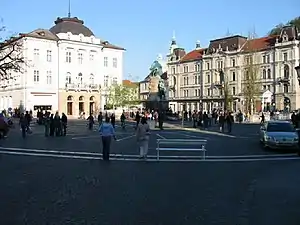 La pharmacie centrale se trouve à l'extrémité est de la place Prešeren, derrière le monument Prešeren. À droite, de l'autre côté de la Ljubljanica, se dresse le palais Kresija.