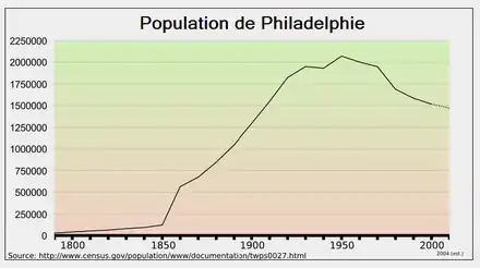 Dans la deuxième moitié du XVIIIe siècle, Philadelphie était devenue la cité la plus peuplée des Treize Colonies (45 000 habitants en 1780[15]), dépassant Boston. Elle disputait même avec Dublin la place de deuxième ville de l'empire britannique, en dehors de l'Angleterre[12].