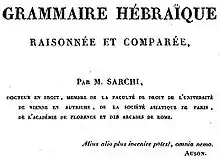 Léon Halévy indique que « M. Sarchi prend place au rang de nos premiers philologues, et sa grammaire parmi les plus beaux ouvrages qu'ait produits l'étude des langues »[23], et que sa grammaire hébraïque a reçu aussi les suffrages de Silvestre de Sacy[24],[23]. Ce dernier a participé à la grammaire par ses suggestions et ses conseils, suivis par Sarchi, mais qui ont donné lieu à une polémique de terminologie avec Sam. Lee[25]. Cette grammaire est plusieurs fois rééditée, avec ajouts et corrections, puis copiée ou prolongée par d'autres auteurs[26].