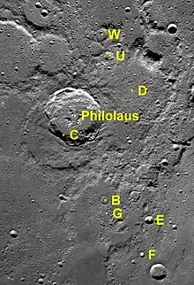 Par convention, les cratères satellites sont identifiés sur les cartes lunaires en plaçant la lettre sur le côté du point central du cratère qui est le plus proche de Philolaus.