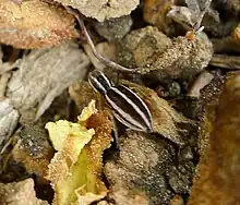 Le tégument de ses individus est recouvert d'une dense pilosité dotés de squamules. Le prosome et l'opisthosome sont de forme allongée chez le mâle, son céphalothorax étant plus bombé et massif que l'opisthosome. Son corps est de couleur brun foncé ou brun grisé avec deux larges bandes longitudinales blanches, des yeux jusqu'au bout du céphalothorax, tandis que l'opisthosome est recouvert d'une bande blanche médiane et de deux bandes latérales blanches.