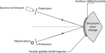 Cette méthode est basée sur la biréfringence des matériaux acquise sous l'effet des contraintes. Cette biréfringence peut être étudiée en analysant la façon dont la polarisation de la lumière est transformée après le passage à travers le matériau. Par exemple, une onde lumineuse polarisée rectilignement pourra ressortir polarisée elliptiquement. Cela s'explique par le fait que les deux composantes de l'onde subissent un retard l'une par rapport à l'autre. Ce retard est directement relié aux contraintes présentes dans le matériau. On peut donc mesurer les contraintes grâce à cette modification de la polarisation.