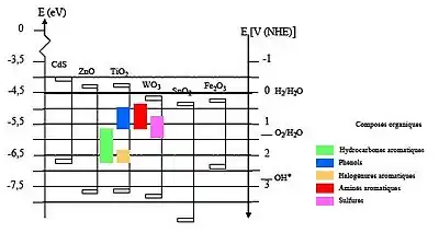 Les photocatalyseurs les plus couramment employés sont des semi-conducteurs ayant une large bande interdite ou gap. Souvent, ce sont des oxydes ou des sulfures (TiO2, ZnO, CeO2, ZrO2, SnO2, CdS, ZnS, etc.). Les potentiels électrochimiques des semi-conducteurs et des couples redox O2/H2O et H2/H2O montre qu'une interaction entre ceux-ci est possible. En effet, les espèces radicalaires sont formées à partir d'O2 (oxydation) et d'H2O (réduction).
