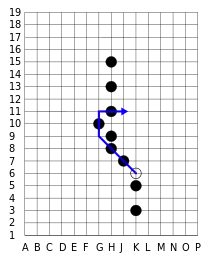 - Le déplacement de K6-G9-J9-G7 ne serait pas légal, car cela ferait sauter l'homme sur H8 deux fois. En application stricte de la règle, le premier saut K6-G9 a supprimé l'homme en H8, qui ne peut donc pas servir à une troisième étape.