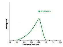 La phycocyanine absorbe les lumières orange et rouge, dans des longueurs d'onde plutôt proches de 620 nm (dépendant de son type spécifique), et émet de la fluorescence à environ 650 nm (dépendant aussi de son type). L'allophycocyanine absorbe et émet à des longueurs d'onde plus élevées que la phycocyanine C ou la phycocyanine R.