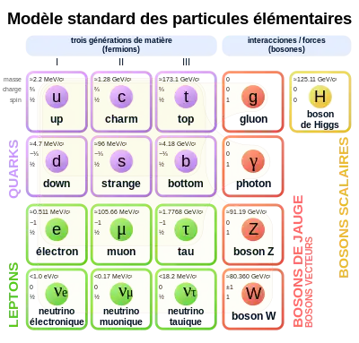 Toutes les particules fondamentales prédites par le modèle standard ont été observées dans les accélérateurs de particules. Le boson de Higgs résulte du mécanisme de Higgs tel que l'explique le modèle standard, qui décrit comment est brisée la jauge de symétrie SU(2) et comment les particules fondamentales acquièrent de la masse. Il demeure (en date de 2014) la dernière particule prédite par le modèle standard à avoir été observée. Le , les scientifiques du CERN du grand collisionneur de hadrons (Large Hadron Collider, LHC) ont annoncé la découverte d'une particule compatible avec le boson de Higgs, de masse approximative 126 GeV/c2. L'existence d'un boson de Higgs a été confirmée le , alors même que l'on recherche encore la confirmation qu'il dispose de toutes les propriétés prévues par le modèle standard[11].