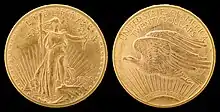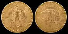 En 1905, le président Theodore Roosevelt demande à son ami Augustus Saint-Gaudens d'améliorer les motifs des pièces de monnaie américaines. Saint-Gaudens accepte cette tâche pour la somme de 5 000 dollars et décide de s'inspirer des motifs de la Grèce antique dans son travail[25]. L'avers du projet représente la personnification de la Liberté, marchant avec un pied appuyé sur une pierre. Elle tient une branche d'olivier dans sa main gauche et une torche dans la droite. Derrière la figure, des rayons et le bâtiment du Capitole sont visibles. Le long du bord, des étoiles à six branches, au-dessus est inscrit le mot « LIBERTY ». L'année d'émission, en chiffres romains, est placée en bas, à droite. Le revers de cette variante présente un aigle volant vers la gauche, emprunté par Saint-Gaudens au cent Flying Eagle. En arrière-plan derrière l'aigle, des rayons et le soleil sont visibles. Au-dessus de l'aigle, le long du bord, le nom du pays « UNITED-STATES-OF-AMERICA », et en dessous, le montant avec le nom de la devise « TWENTY DOLLARS »[26]. Pendant la frappe de cette variante, des travaux sont entrepris pour améliorer son image. De 1907 à 1908, une pièce à bas-relief est frappée, avec l'année inscrite en chiffres arabes et sans la devise « In God We Trust », ce qui ne plaît pas au président[27]. En 1908, l'image de la pièce est modifiée une fois de plus. La devise « In God We Trust » est ajoutée, se trouvant au-dessus du contour du soleil. Les rayons du soleil sont également améliorés[28].