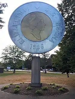 | 2022 | Décès d'Élizabeth II | Brent Townsend | 3 675 000[17] | Pièce émise à l'occasion du décès de la reine Élizabeth II. Avec le même design qu'une pièce de deux dollars ordinaire, sauf que l'anneau extérieur est noir, comme une bande de deuil, au lieu de son argent habituel[18]. La coloration est obtenue grâce à l'utilisation de nickel noir[19]. |