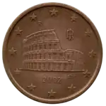 Une vue des ruines du Colisée, à Rome. À droite, la mention du pays émetteur représenté par les lettres R et I (pour Repubblica italiana) superposées. En bas, le millésime. Le tout est entouré des 12 étoiles du drapeau européen. | |