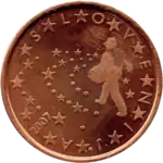 Un homme semant 13 étoiles et 27 points, d'après le tableau Le Semeur du peintre slovène Ivan Grohar. Le tout est entouré des 12 étoiles du drapeau européen entre lesquelles sont disposées les lettres du nom du pays émetteur SLOVENIJA et le millésime en oblique. | |