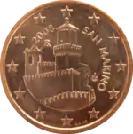 Une partie de la forteresse de Guaita, sur l'un des trois pics du Mont Titano. À droite, en arc de cercle, la mention du pays émetteur SAN MARINO et, en haut, le millésime. Le tout est entouré des 12 étoiles du drapeau européen. | |
