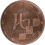 La partie centrale de la pièce représente les lettres «HR» en écriture glagolitique (variante angulaire) sous forme de ligature, avec le damier croate en arrière-plan. Les lettres «HR» sont le code officiel ISO 3166-1 alpha-2 pour la Croatie. Le tout est entouré des 12 étoiles du drapeau européen. | |