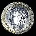 | Avers : L'inscription « repvbblica italiana » et Italia turrita (figure allégorique féminine personnifiant l'Italie) | Revers : Carte de l'Europe avec Allemagne réunifiée, valeur faciale et l'année | ||||