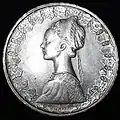 | Avers : Buste de femme entouré de 19 blasons de villes et régions | Revers : L'inscription « repvbblica italiana » et trois caravelles | ||||