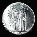 | Avers : L'inscription « repvbblica italiana » et Italia turrita (figure allégorique féminine personnifiant l'Italie) | Revers : Couronne arborée, valeur faciale et l'année | ||||