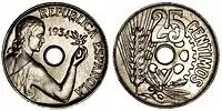 25.20 | 7,00 g | nickel | une allégorie de la république avec la mention REPUBLICA ESPAÑOLA et le millésime | la valeur faciale 25 CENTIMOS, une roue dentée et des épis de blé | 1934 | |