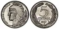 | 10 centimes | 20.00 | 3,75 g | Fer | le blason espagnol avec la mention REPUBLICA ESPAÑOLA | la valeur faciale 10 CENTIMOS et le millésime | 1938 | ||