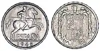 20.00 | 1,25 g | aluminium | un cheval monté avec la mention ESPAÑA | la valeur faciale CINCO CENTI autour des armoiries de l'Espagne | 1940-1941-1945-1953 | |