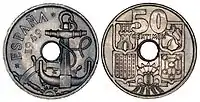 30.30 | 12,50 g | la valeur faciale 50 PTAS à côté des grandes armoiries de l'Espagne franquiste sur un aigle | ||||