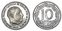 17.50 | 0,80 g | aluminium | (première) tête de Franco à droite avec la mention FRANCISCO FRANCO, CAUDILLO DE ESPAÑA POR LA G. DE DIOS et le millésime | la valeur faciale 10 CENTIMOS entourée de feuilles d'olivier | 1959 | |