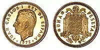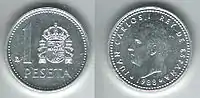 21.00 | 1,20 g | Aluminium | portrait du roi Juan Carlos à gauche avec la mention JUAN CARLOS, REY DE ESPAÑA et le millésime | la valeur faciale 1 PTA à gauche des armoiries de l'Espagne | ||