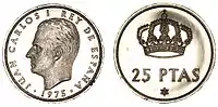 Sur cette première série, la tête du souverain remplace la tête du caudillo. Les attributs de l'Espagne royaliste réapparaissent sans référence au franquisme