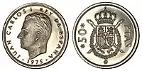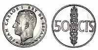 1,00 g | aluminium | (première) portrait du roi Juan Carlos à gauche avec la mention JUAN CARLOS, REY DE ESPAÑA et le millésime | la valeur faciale 50 CTS devant un globe terrestre et un ballon | 1980 | ||