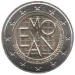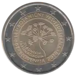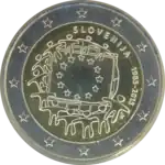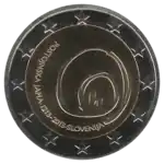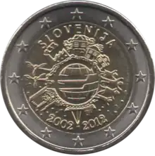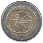 Tous les pays de la zone euro ont émis le 1er janvier une pièce commémorative de 2 € pour célébrer le 10e anniversaire de l'Union économique et monétaire. Le centre de la pièce illustre une silhouette humaine stylisée dont le bras gauche est prolongé par le symbole de l'euro. Le nom du pays émetteur SLOVENIJA apparaît dans la partie supérieure, tandis que l'indication 1999-2009 et l'acronyme EMU (pour Ekonomska in monetarna unija, Union économique et monétaire ou UEM) apparaissent dans la partie inférieure. L'anneau externe de la pièce représente les douze étoiles du drapeau européen. | ||||||