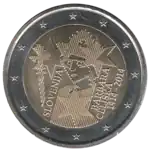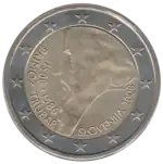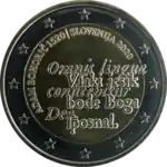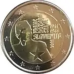 La pièce de 2 euros représente France Prešeren (1800-1849), poète slovène. C'est la septième strophe de son poème Zdravljica qui fut retenue pour composer, en 1991, l'hymne national. Les premiers mots figurent sur la pièce sous son profil.