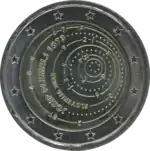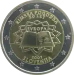 Tous les pays de la zone euro, dont la Slovénie, ont émis le 25 mars 2007 une pièce commémorative de 2 € pour célébrer le 50e anniversaire du traité de Rome. Le centre de la pièce représente le traité signé par les six États membres fondateurs devant un arrière-plan évoquant le dallage, dessiné par Michel-Ange, de la place du Capitole, à Rome, où le traité a été signé le 25 mars 1957. Le mot EVROPA (Europe) figure au-dessus du livre. La légende RIMSKA POGODBA (Traité de Rome) et 50 LET (50 ans) est inscrite au-dessus du dessin. Le millésime 2007 et le nom du pays émetteur SLOVENIJA sont inscrits sous le dessin. L'anneau externe de la pièce comporte les douze étoiles du drapeau européen. | ||||||