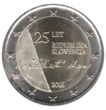 Une reproduction de la fin du deuxième vers de l'hymne national slovène, Zdravljica, écrit par France Prešeren provenant d'un manuscrit barré : dočakat' dan (à voir le jour), en dessous de la mention du pays émetteur REPUBLIKA SLOVENIJA, elle-même en dessous de la légende 25 LET (25 ans). En bas, le millésime 2016. Le noyau de la pièce est traversé par une ligne oblique à l'emplacement d'une des barres obliques du manuscrit. L'anneau externe de la pièce comporte les douze étoiles du drapeau européen.